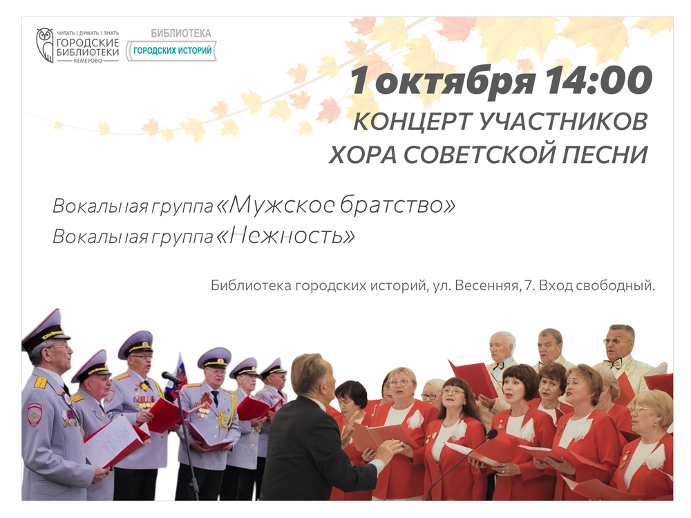 01.10 |  | Концерт участников Хора Советской песни – вокальной группы «Нежность» и вокальной группы «Мужское братство» в Библиотеке городских историй |