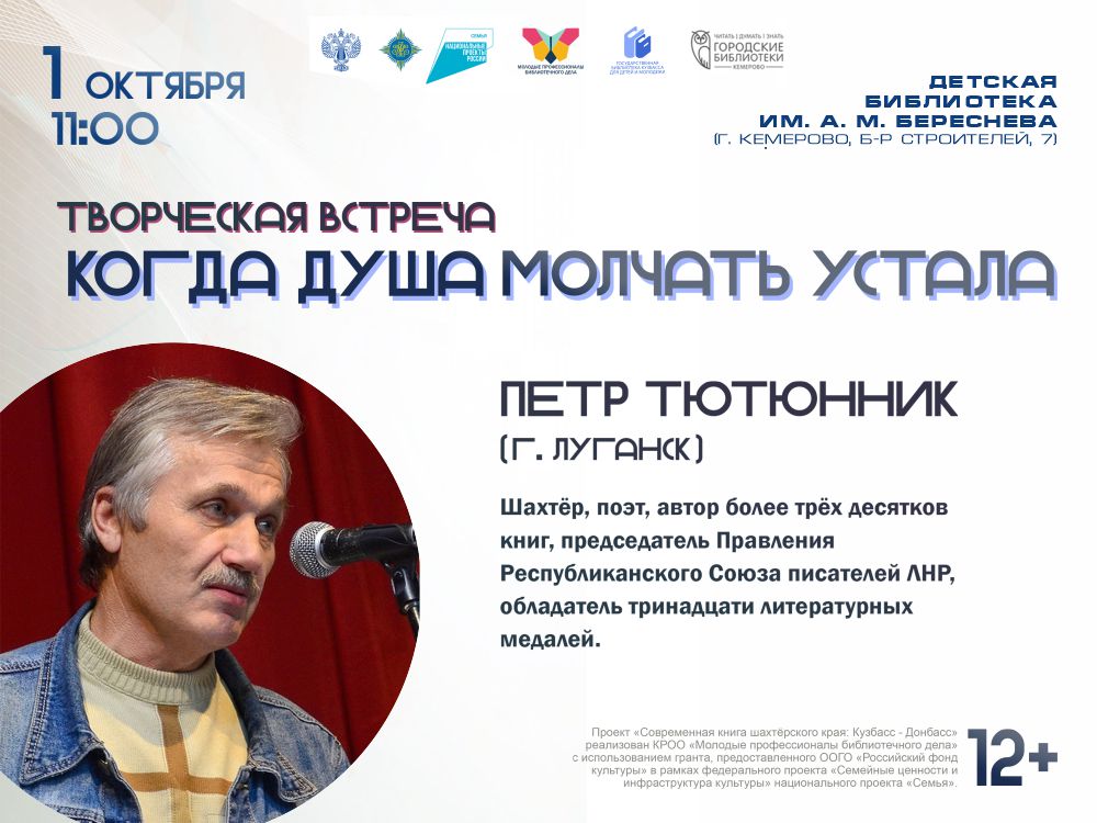 01.10 |  | Творческая встреча «Когда душа молчать устала» с Петром Алексеевичем Тютюнником в Детской библиотеке им. А. М. Береснева |