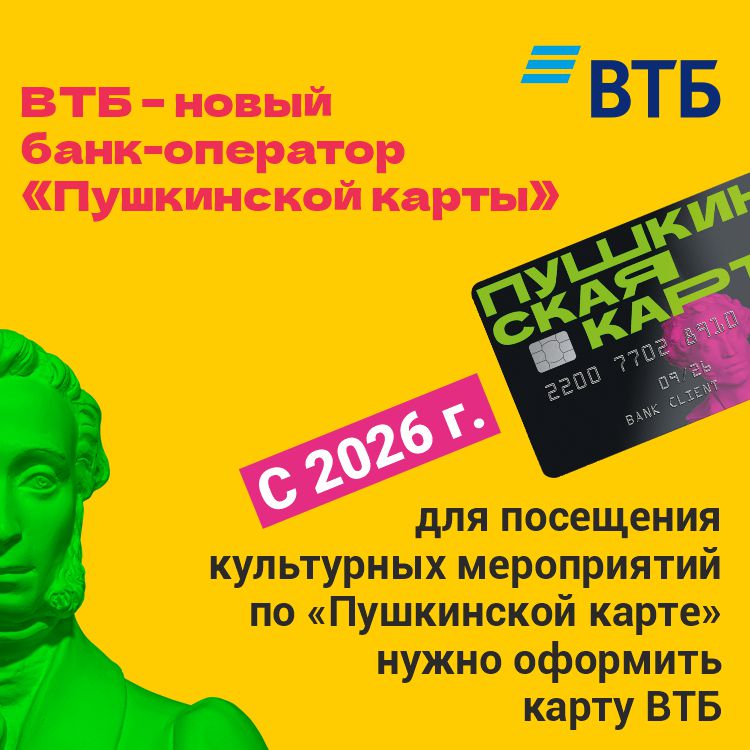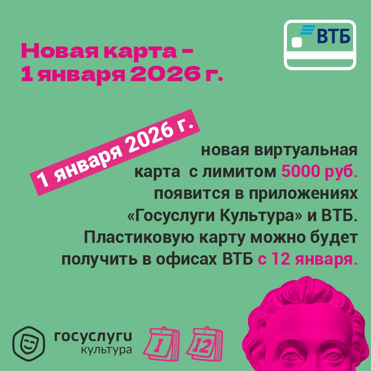 Пушкинская карта![]() ![]() ![]() ![]() Что такое программа «Пушкинская карта»«Пушкинская карта» — это государственная программа, которая позволяет молодым людям в возрасте от 14 до 22 лет включительно тратить бюджетные средства на посещение культурных мероприятий, таких как театры, музеи, выставки, библиотеки и кинотеатры. Участникам программы ежегодно начисляется определенная сумма на специальную карту платежной системы «Мир». Потратить эти деньги можно только на культурные мероприятия, участвующие в программе. Участники: Граждане России в возрасте от 14 до 22 лет. Как оформить «Пушкинскую карту»?Старт программы произошел 1 сентября 2021 года. Чтобы принять участие в программе, гражданину нужно будет зарегистрироваться на портале «Госуслуги», установить мобильное приложение «Госуслуги.Культура» и получить «Пушкинскую карту» — виртуальную или пластиковую карту платежной системы «Мир». Инфографика по оформлению карты: доступно в AppStore, Google Play, AppGallery и RuStore Внимание! С 1 января Банк ВТБ 2026 года станет новым оператором программы «Пушкинская карта», которая реализуется при поддержке нацпроекта «Семья». Владельцы Пушкинских карт могут подать заявление на перевыпуск карты Банком ВТБ через приложение «Госуслуги. Культура», а также в приложении и офисах «Почта Банка», текущего оператора программы. Карта с обновленным лимитом в 5000 руб. появится 1 января в приложениях «Госуслуги. Культура» и мобильном приложении Банка ВТБ. Пластиковую карту можно будет получить в офисах банка с 12 января. Текущие Пушкинские карты будут действовать до 31.12.2025. Как принять участие в программе?
